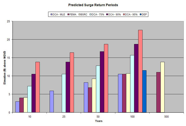 Plot of predicted surge elevation for various return periods as provided by different state and federal agencies, illustrating need for improved analysis