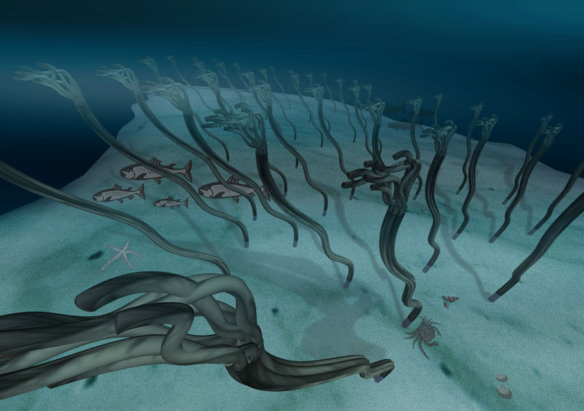 An artificial kelp bed simulates the natural plants with a grid of buoyant, synthetic rope, "planted" in the sea bed. Each length of rope is jetted into the sand bottom below the maximum scour depth. The rope floats upward to just below the surface or, if longer than the water depth, can simply lay over on top of the water - just as natural kelp does. The ends can be whipped to prevent fraying, or allowed to fray and provide thousands of interstices for smaller organisms. Leaf-like shapes could also be incorporated into the ends if desired, to enhance the looks and add buoyancy.