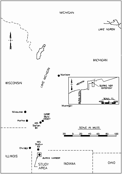 Burns Harbor, Indiana is located on the southern end of Lake Michigan (Figure 1). The configuration of Lake Michigan exposes the harbor to significant wave energy from the northern quadrant. Maximum fetch is about 300 miles, to the north. Water levels fluctuate seasonally more than a meter due to regional precipitation and nearly a meter during storms from wind setup/setdown.