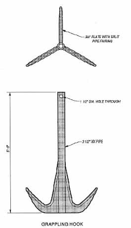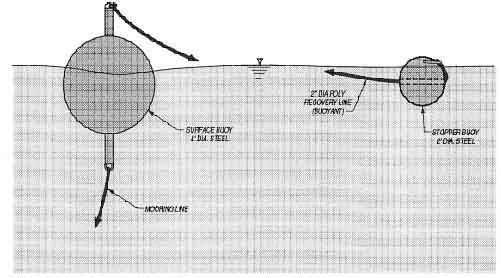 In addition, a transponding acoustic beacon is usually included to provide a means of locating the frame in the event it became separated from the surface float. A 4-part lift bridle, made from 1 in. ( 2.5 cm) diameter double-braided Dacron line, is secured at each corner with 2 in. (5 cm) shackles. The four lift lines converge to a 1 in. (2.5 cm) section steel D-ring, approximately 1 m above the base of the frame. A subsurface buoy secured to the D-ring prevents the slack bridle from becoming entangled in the frame or instruments during a measurement. The float should have about 15 kg of positive buoyancy, and be rigid, so it will maintain buoyancy at depth. Mooring Line: The mooring line is a 1 in. (2.5 cm) diameter synthetic line, with an aramid braided core and a double braided polyester jacket for abrasion protection. This is a torque-balanced construction that combines high strength (25,900 kg breaking) with extremely low stretch (< 1 per cent at 30 per cent of rated strength). The length is adjusted to about twice the maximum water depth expected - about 65 m for the MCR experiment. Soft eyes (i.e., without thimbles) are back-spliced in each end for connecting to 2 in. (5 cm) shackles. Surface Buoy: The surface buoy is a 4-ft (1.2 m) diameter spherical buoy made from rolled 1/4 in. (6 mm) steel plate (Figure 3). A 1.8 m long, 4 in. (10 cm) diameter schedule 80 steel pipe forms a strain member through the central, vertical axis. An internal padeye on the bottom of the pipe accepts a 2 in. (5 cm) shackle. The weight of the buoy is about 275 kg. To improve pitch/roll stability of the buoy, an additional 360 kg of 2 in (5 cm ) anchor chain was attached to the bottom of the pipe as external ballast, providing a metacentric height of approximately 15 cm. The attachment point for the recovery line is a welded bail of 1 in. (2.5 cm) steel bar at the top of the central pipe. A battery-powered light can be placed under the bail if the system is to be left at sea overnight. Recovery Line: The buoyant recovery line is a 30 m length of 2 in. (5 cm ) diameter, three strand, braided polypropylene line. The line is attached to the bail on the surface buoy with a 2 in. (5 cm) shackle and a 50-ton (45,000 kg) rated crane swivel. Stopper Buoy: A 2-ft (61 cm) diameter spherical buoy of 1/4 in. (6 mm) steel serves as the stopper to capture the grappling hook as it slides down the recovery line (Figure 3). A 3 in. (7.5 cm) schedule 40 steel pipe is welded flush through the center, as a guide for the recovery line, and as compressive reinforcement for the impact loads from the grappling hook. At the opposite side, a 1 in. (2.5 cm), round steel bar is bent into a V-shape and welded to the buoy. The bitter end of the recovery line is pushed through the guide pipe, and a soft eye was back spliced around the V-shaped bar. This arrangement ensured the stopper buoy can not disengage or slide freely down the recovery line. Since chafing of the line against the guide pipe is a concern, the exit hole is carefully radiused and smoothed, and the line wrapped with tape at that point. Grappling hook: The shaft of the hook is a 1.5 m long,
